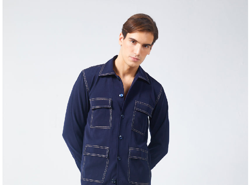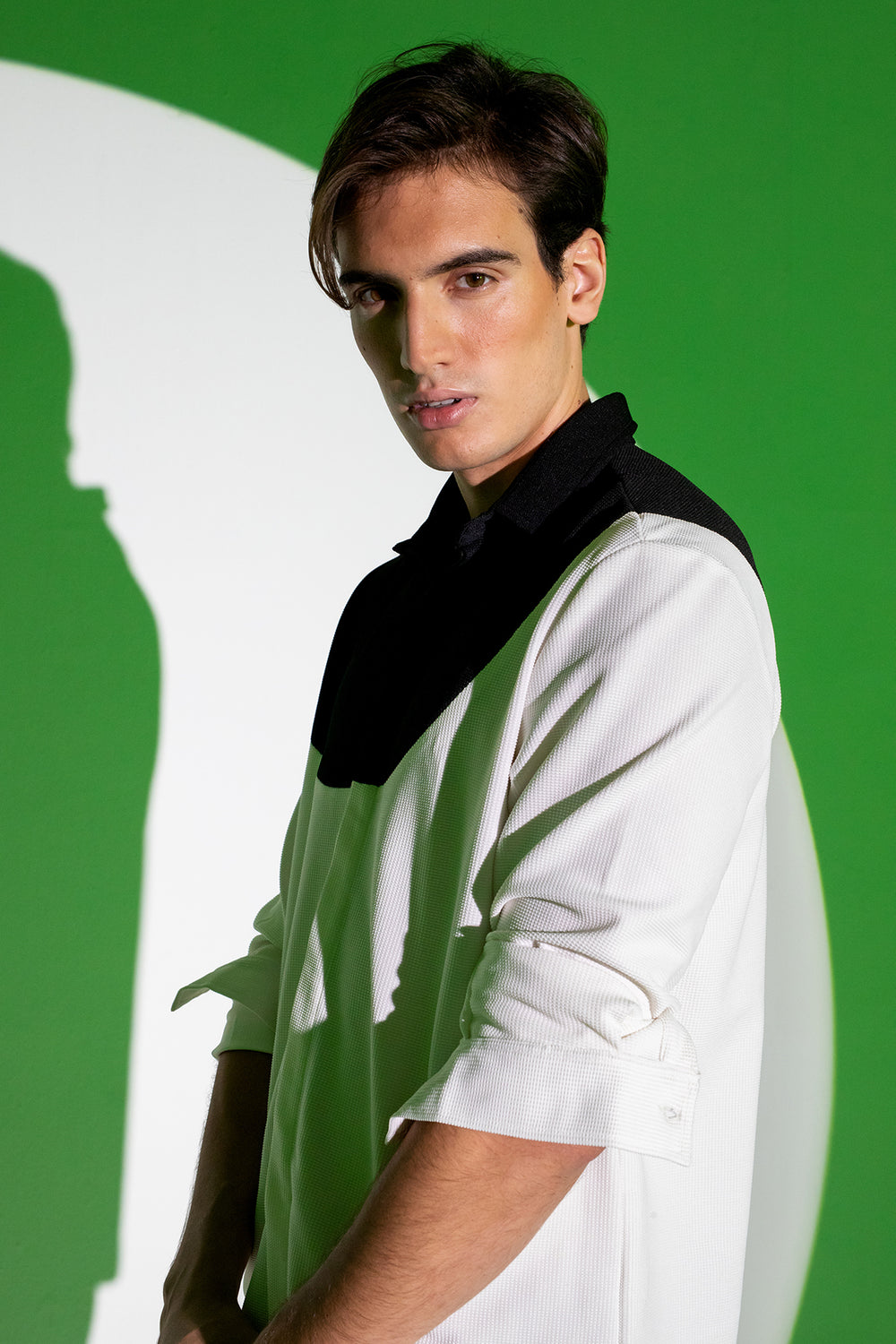 Black and White cut and sew collared jacket with full sleeves and zip up detailing . Black and White cut and sew collared jacket with full sleeves and zip up detailing.