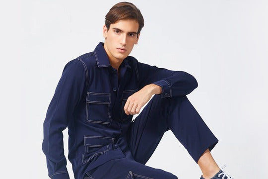 Full-length jumpsuit with lapel collar and batwing sleeves with flap at the hemline. It comes with a waist belt.