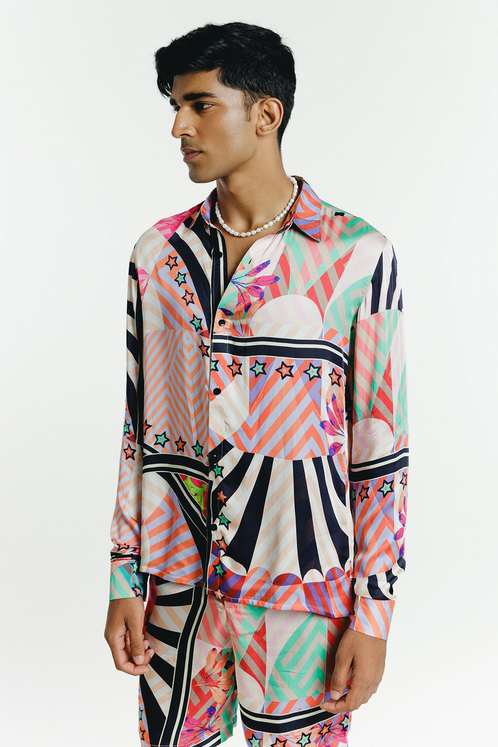 Relaxed fit pink printed shorts with buttons and pockets and elastic at the back.