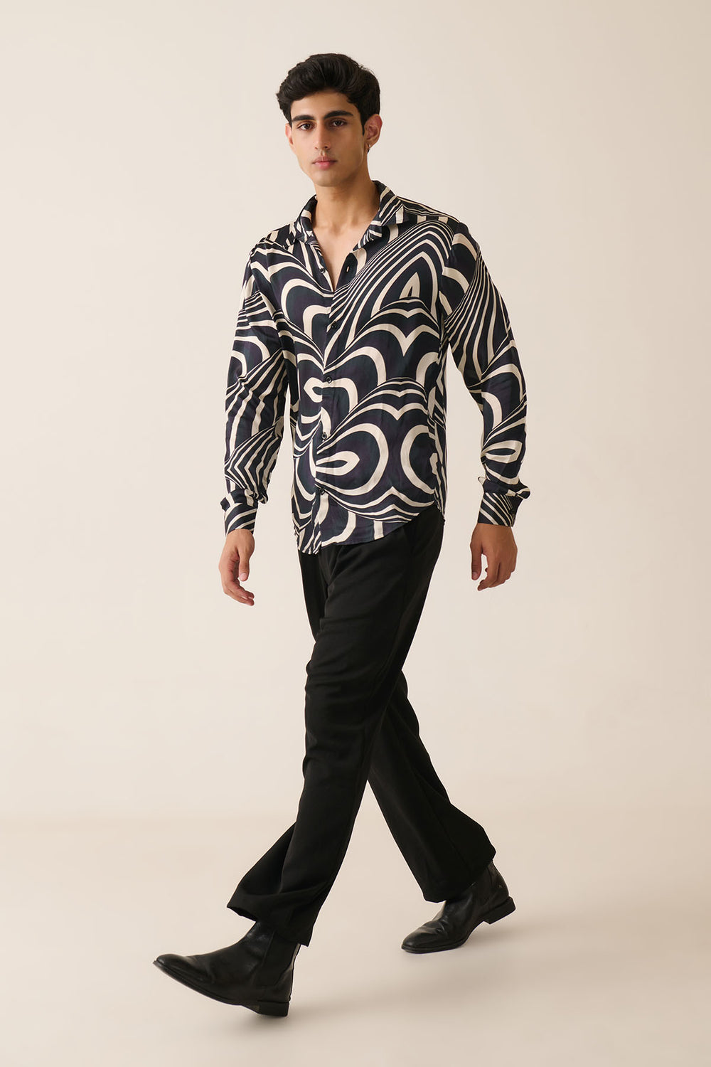 Black illusion relaxed fit collared shirt with full sleeves and a button-up front paired with regular-fit waffle trousers with elastic around the back, and waistband on the front.