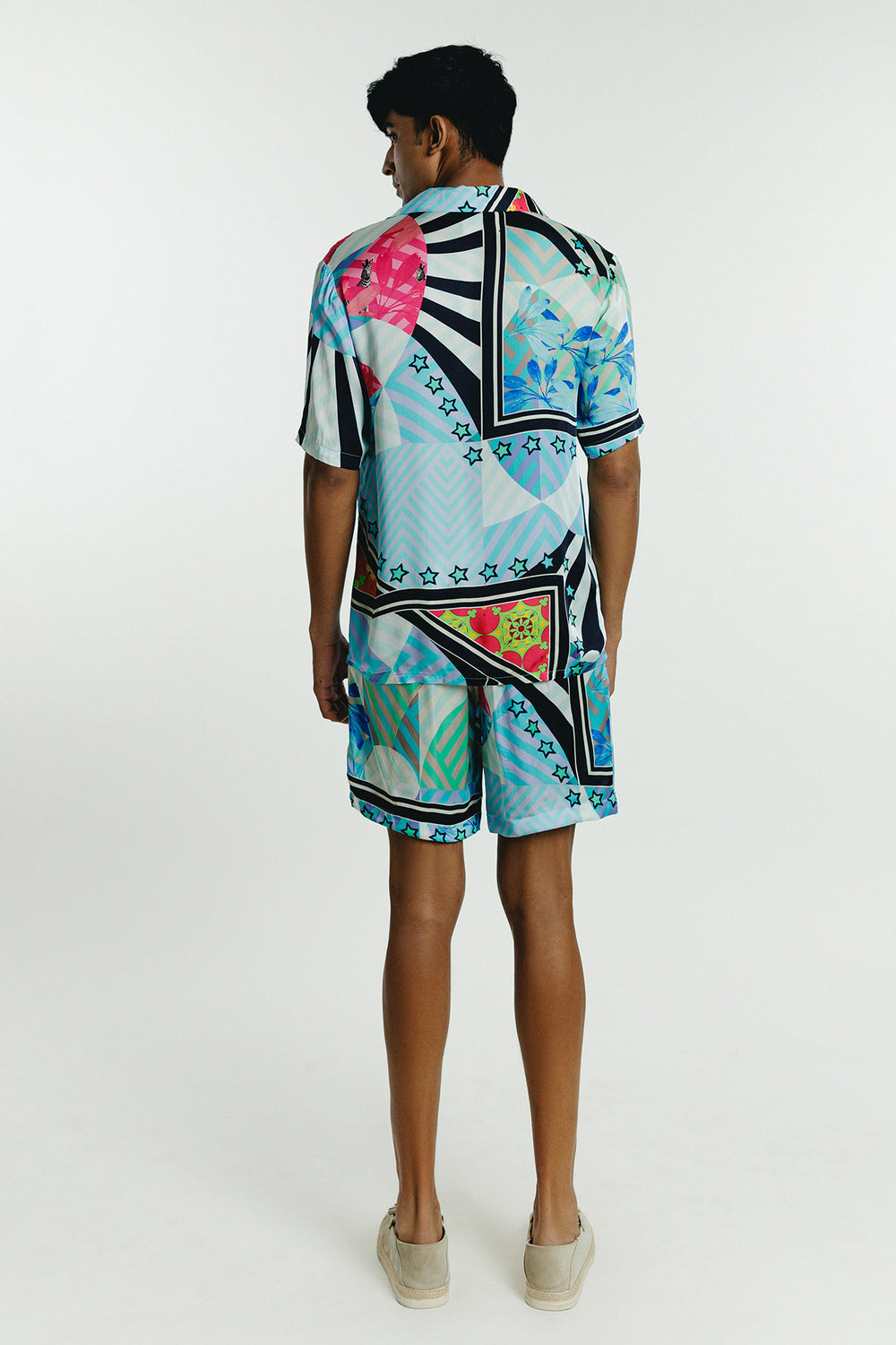 Relaxed fit blue printed shorts with buttons and pockets and elastic at the back.