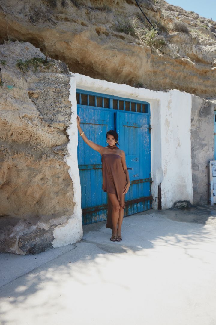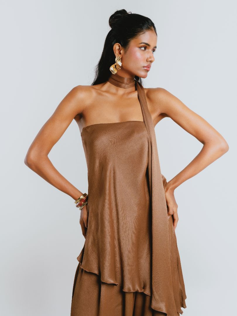 Top : The strapless bandeau/tube top features an asymmetrical overlay that drapes naturally across the body, creating a layered effect while maintaining a clean, minimal neckline all round with back elastic.  The fluid fall in our mocha mousse coloured viscose enhances the silhouette while offering comfort and ease of movement.