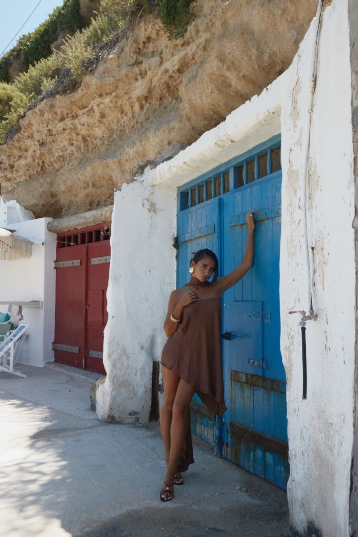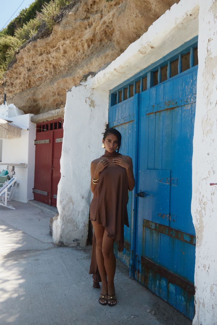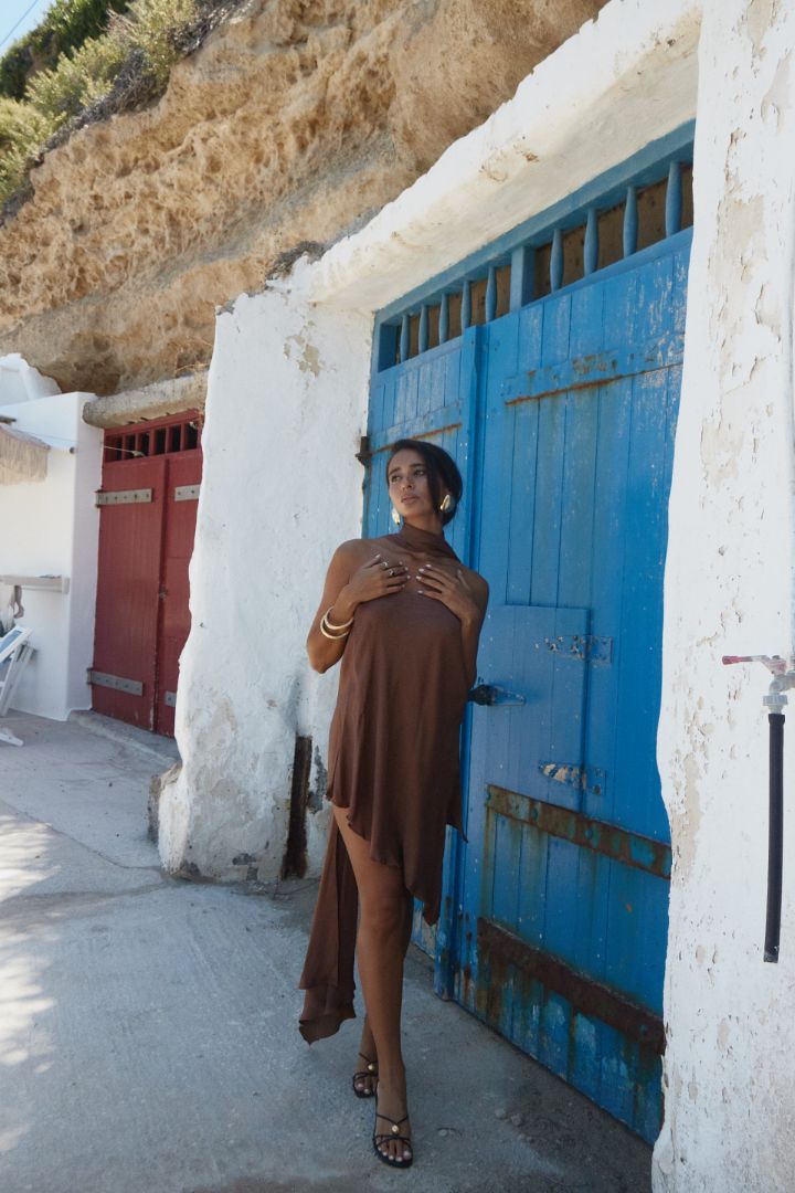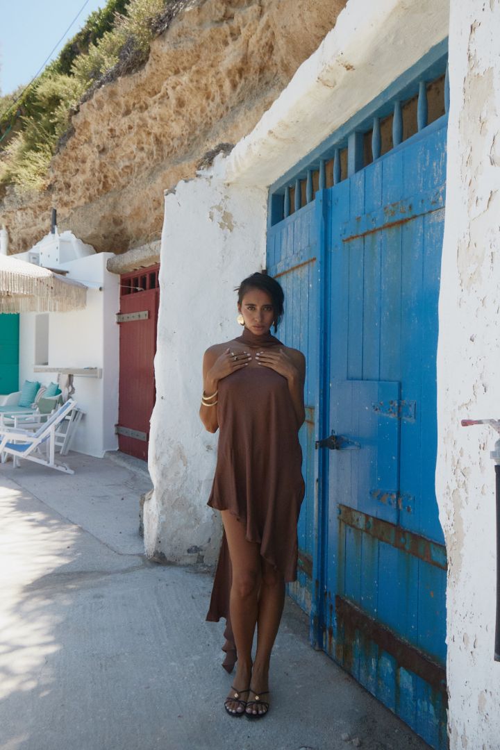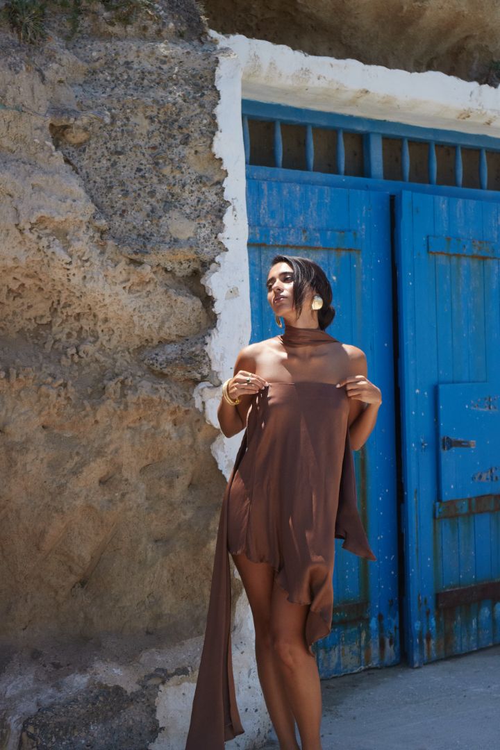 Scarf : A lightweight viscose scarf/dupatta in mocha mousse   designed to be styled multiple ways — draped over the shoulders for an elevated feel, wrapped as a stole, or worn loosely for a relaxed resort-inspired look. The scarf adds softness and dimension while enhancing the overall fluidity of the ensemble.
